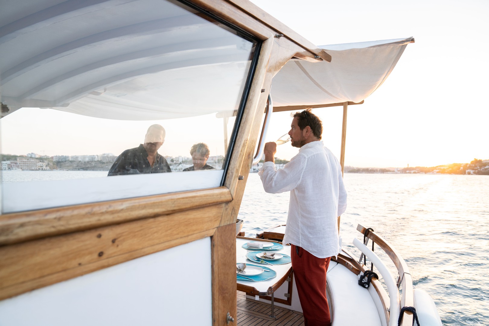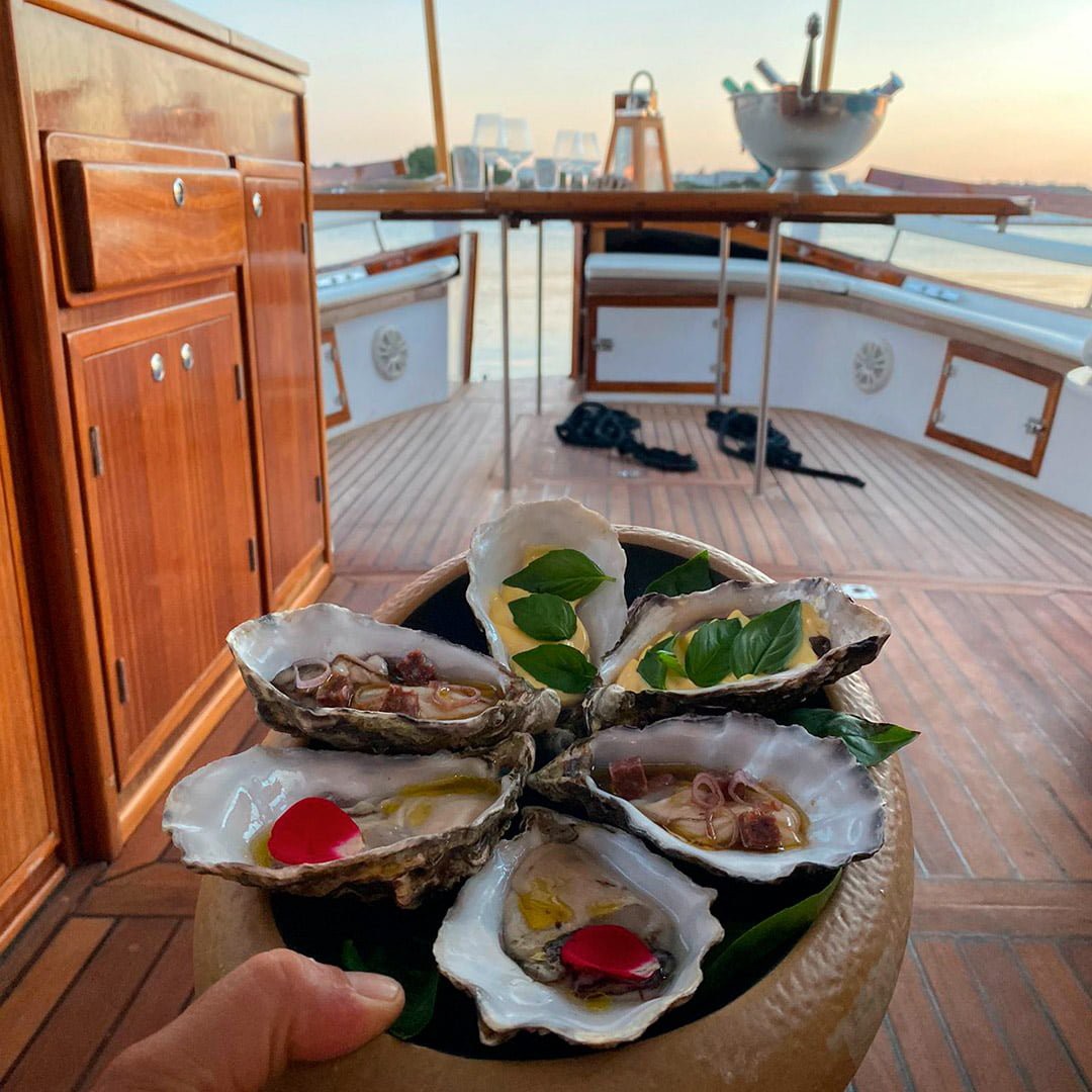 The evening begins as the sun sets, with the boat gentrly cruising through calm waters and past historic landmarks and hidden corners of the harbor. Once anchored in a peaceful location, dinner is served at open sea. Afterwards, you can relax beneath the stars before returning to port.